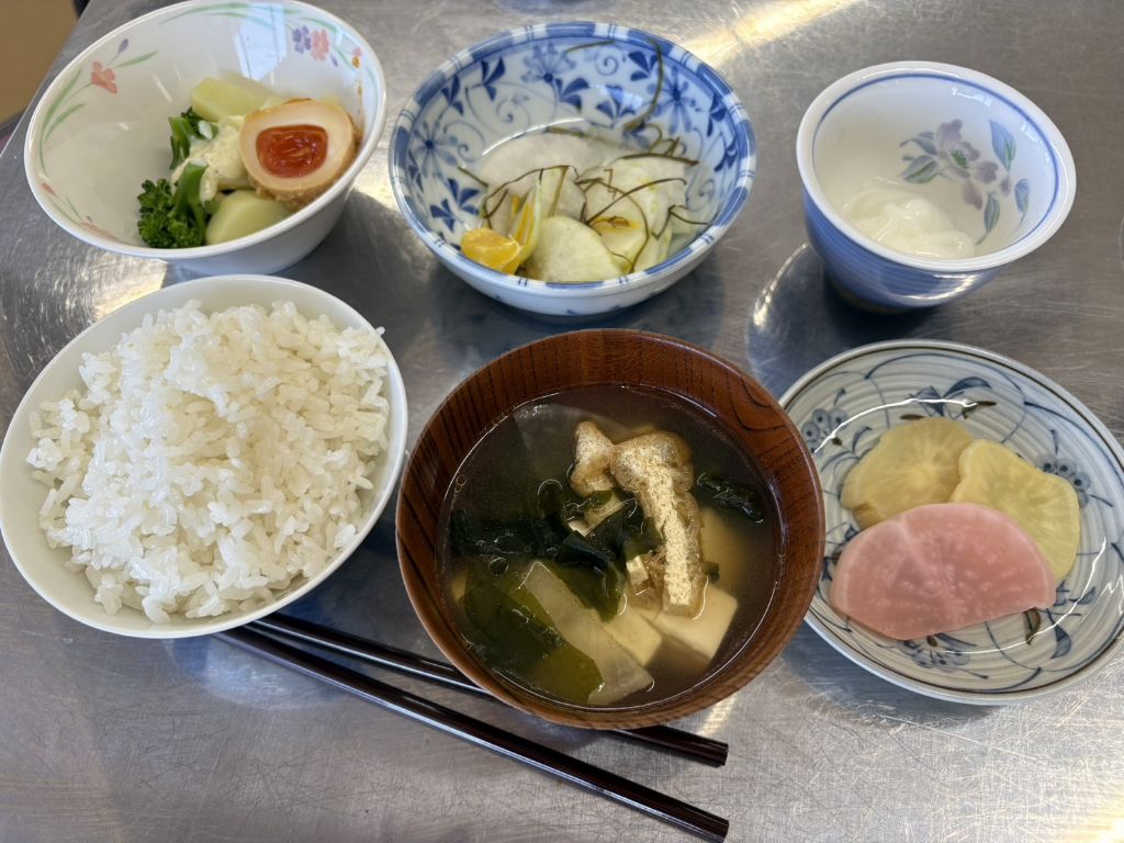 実習では、参加者全員で、大根の浅漬けと鮒ずしの飯(いい)を使ったドレッシングを作り、試食タイムには、これに加え、高島産味噌のお味噌汁、畑漬け、たくあん、他谷さんお手製の鯖のへしこ、サラダというメニューが並びました。