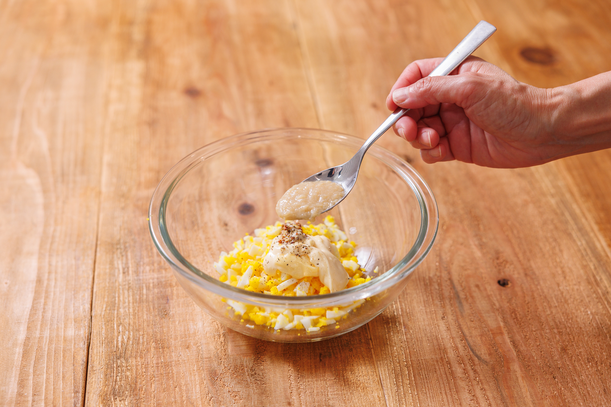 ゆでたまごを粗く刻み、甘酒、マヨネーズ、粒マスタード、塩、黒こしょうを加えてたまごサラダをつくる。
