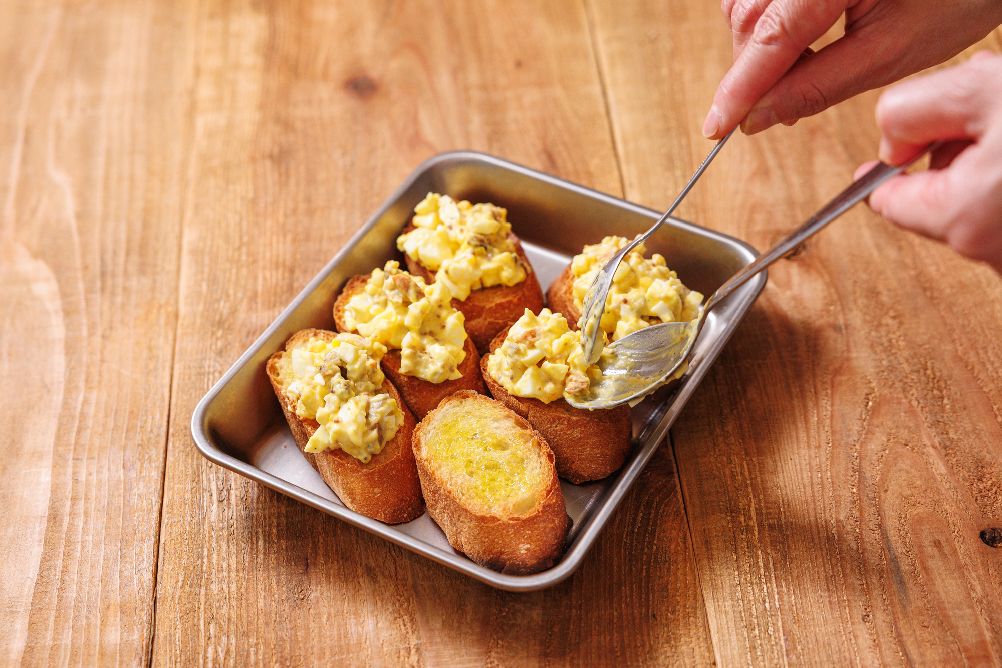 バゲットを焼き目がつくくらい軽くトーストし、表⾯にオリーブオイルを薄く塗る。その上に(2)をたっぷり乗せる。