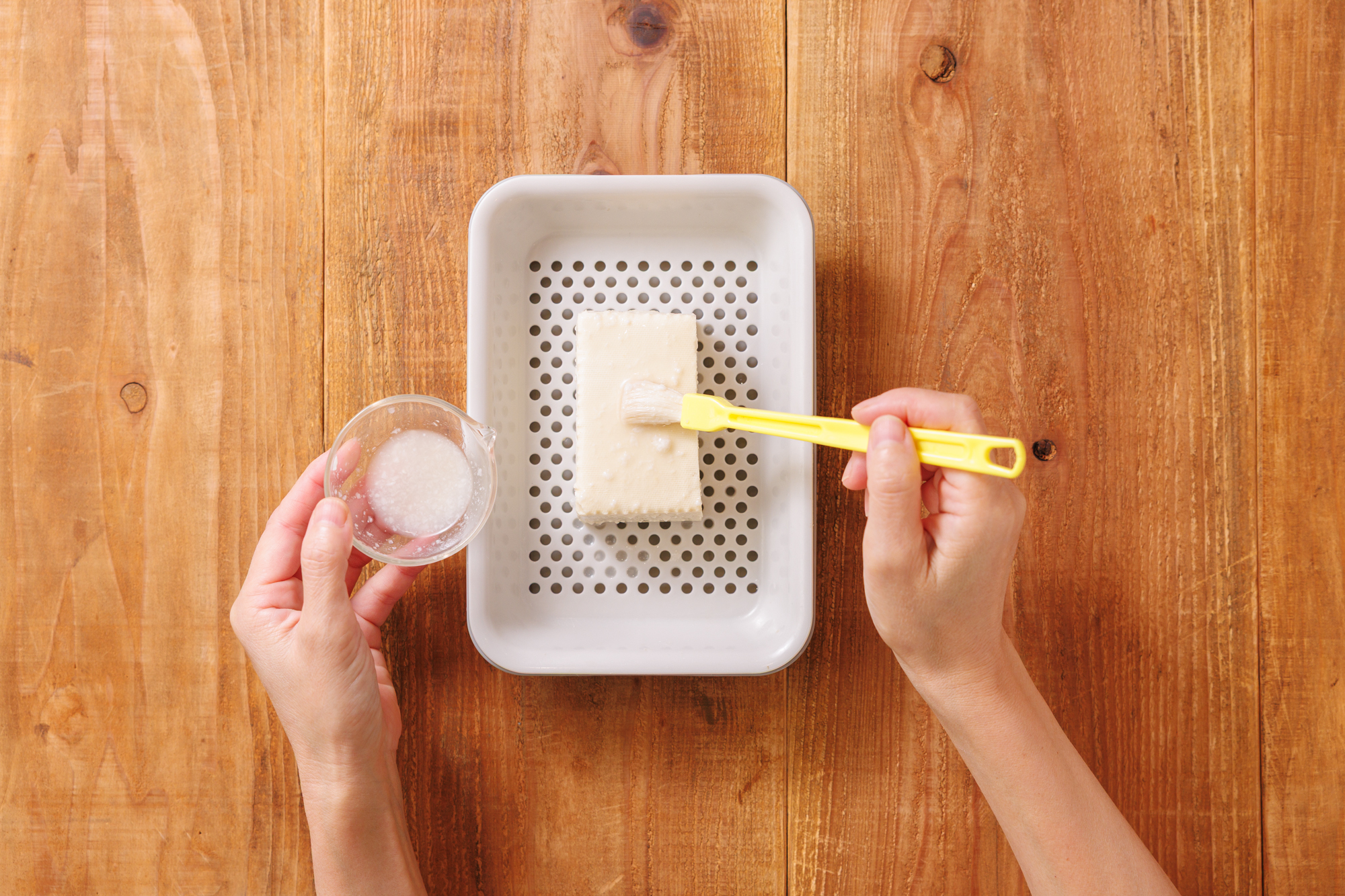 木綿豆腐は軽く重しをして10分ほどおいて水気を切り、大さじ1の塩麹(※分量別)を表面全体に塗る。キッチンペーパーに包んで、食品用ラップに包み、冷蔵庫で半日~1日おく。