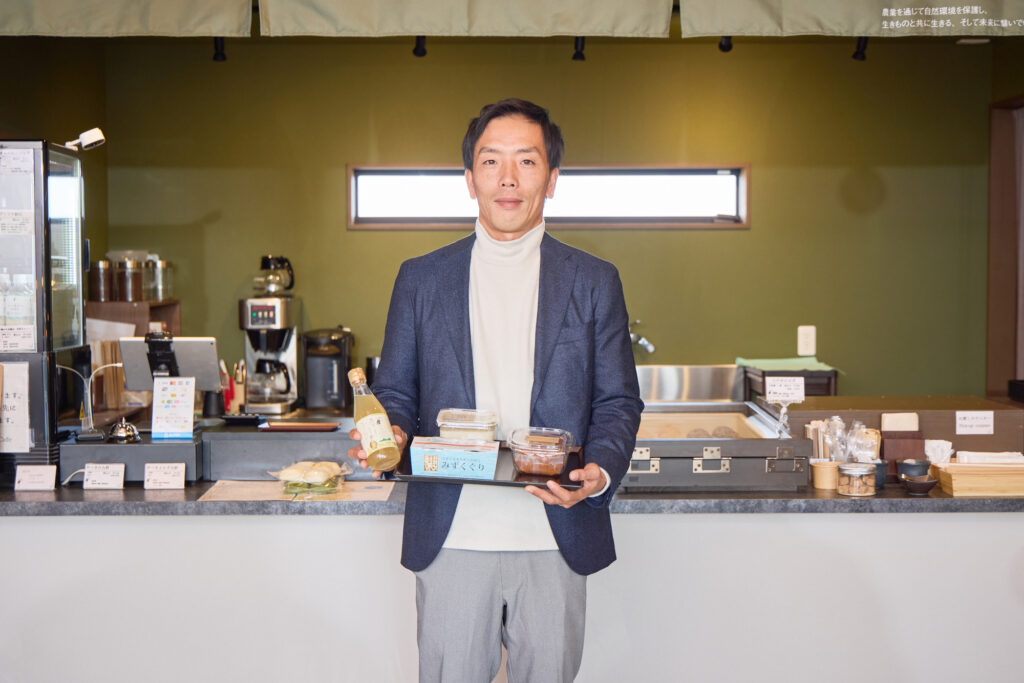 1975年創業の有限会社グリーン藤栄は、高島の水と土に向き合いながら、無農薬・有機栽培を続けてきた農家です。約10年前、東京で服飾アパレルの仕事に携わっていた現社長・梅村さんが高島に戻り、家業を継ぎました。都会で学んだのは、商売の本質は場所が変わっても変わらないということ。そして、「どう伝えるか」の重要性でした。魚道を設け、生き物と共存する農法ができる高島の環境。その背景ごと、きちんと形にして届けたいという想いが、2024年3月にオープンした「百姓菓子処 藤栄+Café」へとつながっています。