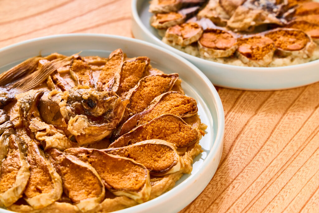 喜多品を象徴するのが、「百匁(ひゃくめ)・百貫・千日」という製法。びわ湖のニゴロブナを木桶に漬け、約3年かけて熟成させます。仕込みでは、鮒の卵を傷つけないよう、ひとつひとつていねいに手をかけることが欠かせません。その積み重ねが、なめらかな味わいにつながっています。北村さんのおすすめは、刻んだ鮒ずしにお湯を注ぐだけのお茶漬け。ふわっと立つ香りとともに、発酵のうまみがゆっくりと広がり、体の奥まであたたまる味わいです。