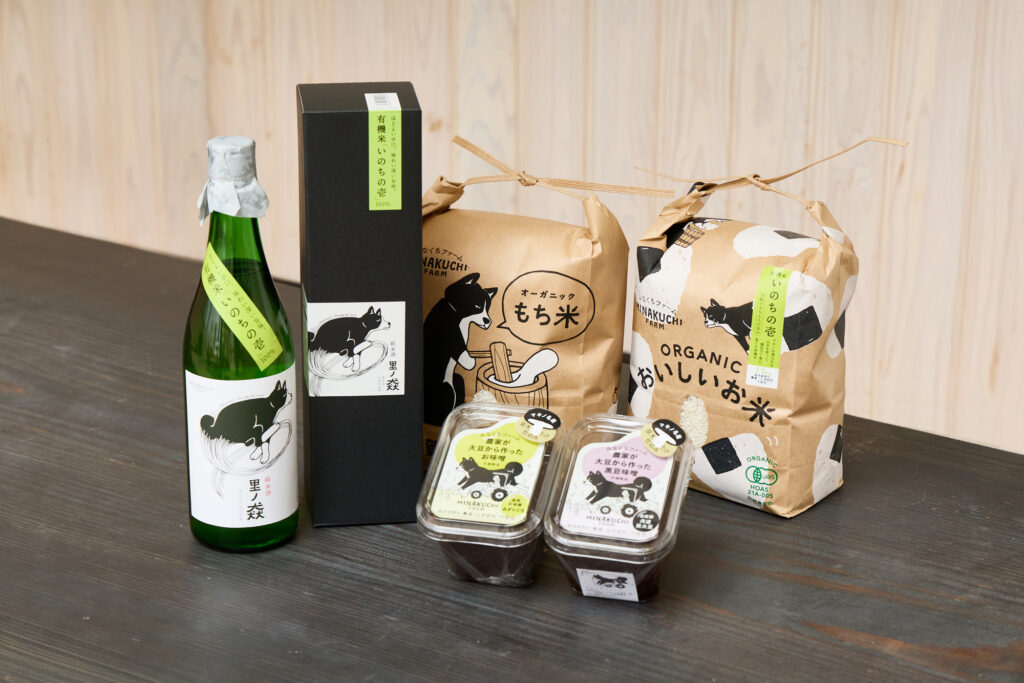 注目したいのは、何といっても発酵食品。味噌は、滋賀の在来種「水くぐり」という希少な大豆と棚田で育てた無農薬米で仕込んでいます。塩と米、大豆だけの素材本来の濃い旨みが楽しめます。日本酒「里の猋」は、水口さん自身は元々日本酒が苦手でしたが、「自分たちが育てた米なら」と情熱を注ぎ、地元マキノ町の吉田酒造で醸造したもの。すっきり飲みやすく、お米のやさしい香りが楽しめます。さらに、味噌や日本酒、米のパッケージには、看板犬の大きな秋田犬がかわいく描かれていて、見た目だけでも思わず手に取りたくなるほどです。
