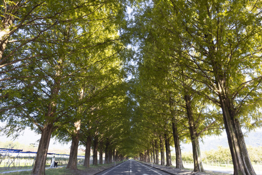 約500本のメタセコイアが続く壮観な並木道。その中心にある「マキノピックランド」は、広々として、開放感に包まれる場所です。果樹園やカフェを巡りながら、高島の自然や食、そして“発酵文化”の豊かさに触れることができ、季節ごとに国内外からたくさんの人が訪れます。敷地内には全6棟のヴィラ型リゾートもあり、宿泊してゆっくり滞在することも可能です。