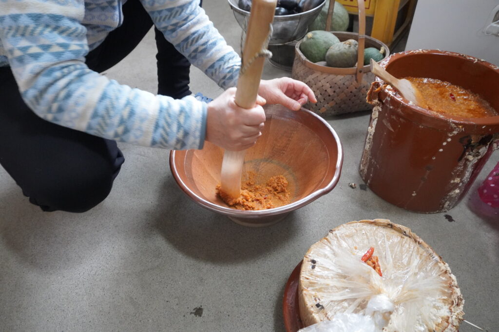 大豆を蒸し、臼で潰し、麹と塩を合わせ、大豆の浸し汁の“呉汁”を加えて混ぜ、唐辛子を入れて米ぬかと塩を呉汁で練った蓋で密閉。材料や工程はシンプルですが、一つひとつ手間と経験が必要です。